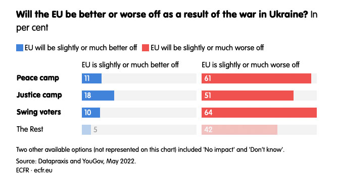 - In allen Ländern, mit Ausnahme Polens, ist das «Friedens»-Lager größer als das «Gerechtigkeits»-Lager. Die europäischen Bürger sorgen sich um die Kosten der Wirtschaftssanktionen und die Gefahr einer nuklearen Eskalation. Wenn sich nicht dramatisch etwas ändert, werden sie sich einem langen und langwierigen Krieg widersetzen. Nur in Polen, Deutschland, Schweden und Finnland findet die Erhöhung der Militärausgaben breite öffentliche Unterstützung.