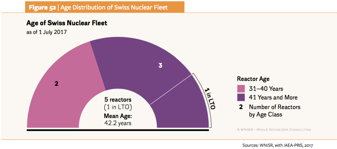 Mit einem Durchschnittsalter von 42,2 Jahren stellt die Schweiz nach wie vor den ältesten AKW-Park der Welt. Der weltweite Durchschnitt liegt bei 29,3 Jahren, derjenige in der EU bei 32,4 Jahren. Neu ist Beznau 1 in der Kategorie «Long-Term Outage (LTO)» erfasst. In diese Kategorie fallen Reaktoren, die im vorausgegangen und der ersten Hälfte des laufenden Kalenderjahres keinen Strom produziert haben. Beznau 1 ist seit 13. März 2015 ausser Betrieb.