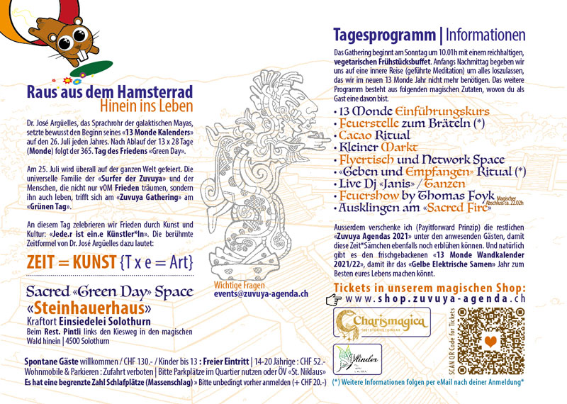 Am Nachmittag gibt u.r.s. jOsé Zuber, auch Herausgeber der Zuvuya-Agenda, einen Einführungsworkshop in den Maya-Kalender und wie man ihn zur Gestaltung des Lebens nutzen kann.