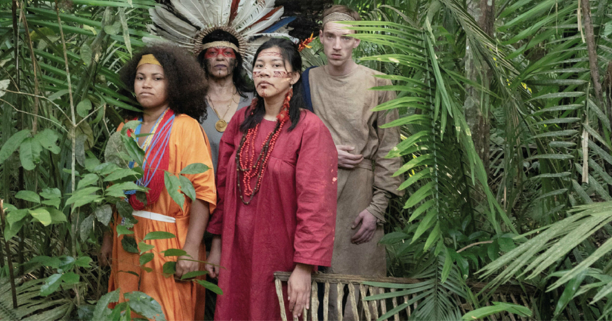 Die «Antigone im Amazonas» wird von einer indigenen Aktivistin gespielt. Kay Sara steht aber nicht auf der Bühne des Burgtheaters – überhaupt sind nur vier Schauspieler live zu sehen. Alle anderen spielen auf der Leinwand, per Videoeinspieler, direkt aus dem Dschungel. Der «Chor» besteht aus Aktivisten, Überlebenden eines Massakers, Indigenen, Kleinbauern. Als «Seher» tritt der indigene Philosoph Ailton Krenak auf.