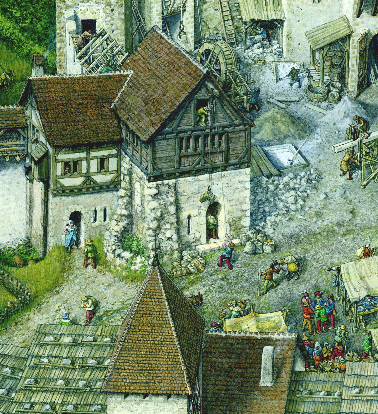 Im städtischen Werkhof am Burgplatz auf dem Terrain des Fürstbischofs von Basel baut die Burgergemeinde an Türmen und Wehrgängen. Es ist Markttag, Bauern und Handwerker bieten ihre Waren auf dem Platz an auf Jörg Müllers Bild von Biel um 1500. Am Eingang der Badstube empfängt die Bademagd einen Kunden, im ersten Stock schaut der Bader – Bademeister, Wundarzt und Kräuterexperte - Rudolf Nüssli aus dem Fenster.