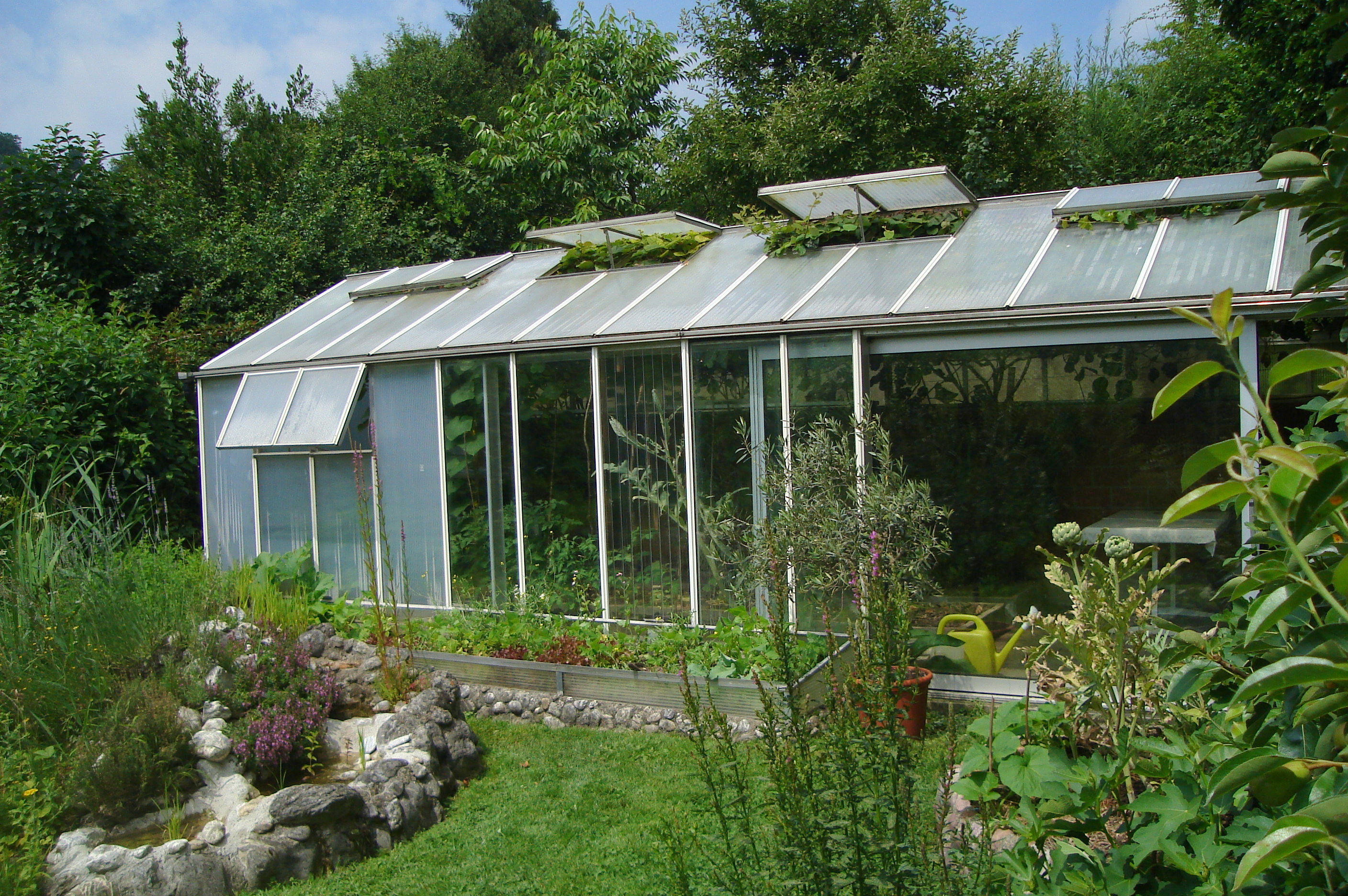 Durch geschicktes, permakulturelles Vernetzen erfüllt das unbeheizte Gewächshaus unterschiedliche Funktionen. Der ganze Bau ist in vier Bereiche gegliedert: das Gewächshaus mit Anbauflächen und Sitzplatz; auf der Südseite sind Solarbeete, die das Haus vor direkter Kälte schützen und die Anbau-Saison verlängern. Im Norden entstand durch die Dachverlängerung ein isolierter Raum, ein Wärmespeicher, der gleichzeitig als Kältepuffer und Windschutz dient.
