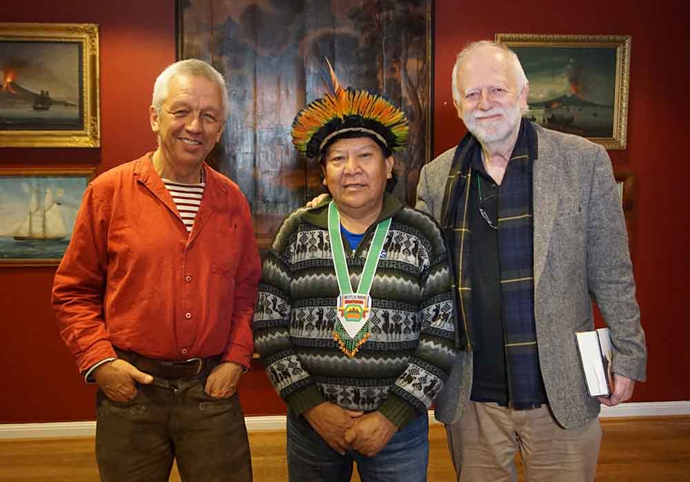 Es geht eine eigene Aura von dem stämmigen, eher kleinen Mann mit dem stillen Lächeln und den warmen und scharf beobachtenden Augen aus. Seine Bewegungen sind bedacht, seine Wahrnehmung nimmt den ganzen Raum ein, die Sprache ist langsam und präzise. Im Betondschungel der westlichen Metropolen ist er nur Gast, sein Zuhause ist das lebendige Gewebe des Amazonas-Waldes voller Wesenheiten – Flora, Fauna, Ahnen, unsichtbare beseelte Kräfte, die er Shapiri nennt.