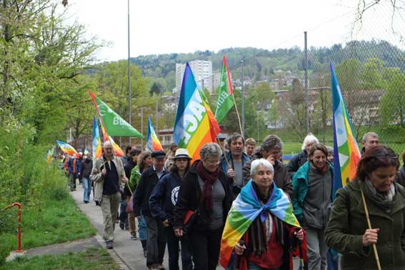 Die Schweiz ist am Gewaltgeschäft nicht unbeteiligt: Sie hilft mit, die Grenzen zu schliessen und verdiente in den letzten Jahr durch Waffenexporte Milliarden. Im Rekordjahr 2011 exportierte die Schweiz für über 870 Millionen Fr. Kriegsmaterial. 2014 hat der Nationalrat die Regelungen für den Kriegsmaterialexport gelockert, die Zahlen werden in Zukunft vermutlich steigen.Der Ostermarsch läuft dieses Jahr deshalb unter folgenden Forderungen:
