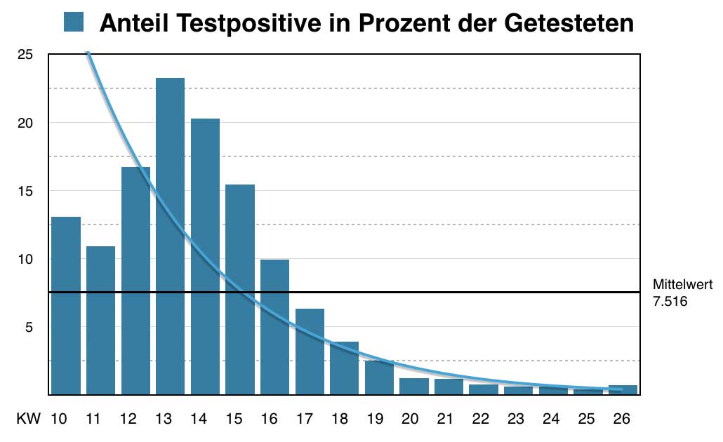 Dass der Anteil der Testpositiven seit Mitte März stetig sinkt – während der Hochsaison des Corona-Virus lag er 40 mal höher –, wird dagegen nicht genannt. Seit fünf Wochen liegt er beharrlich unter 1 Prozent, was in etwa dem viralen Grundrauschen entspricht. Bei Billionen von Viren in jedem Individuum hat es immer von allem ein bisschen in der Gesellschaft.