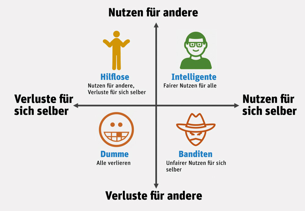 Ein dummer Mensch ist eine Person, die anderen Probleme bereitet und sich selber schadet. Ein intelligenter Mensch ist jemand, dessen Handlungen sowohl ihm selbst als auch anderen zugute kommen. Dann gibt es den Banditen, der sich auf Kosten anderer bereichert. Und schliesslich der Hilflose, dessen Handlungen andere auf seine Kosten bereichern. Cipolla hat daraus ein Diagramm entwickelt.