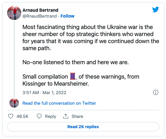 Ein paar Tage nach Beginn der Invasion im Februar dieses Jahres stellte ein Mann namens Arnaud Bertrand einen extrem viralen Twitter-Thread zusammen, in dem es um die verschiedenen Diplomaten, Analysten und Akademiker im Westen geht, die im Laufe der Jahre davor gewarnt haben, dass eine gefährliche Konfrontation mit Russland bevorstehe, und zwar aufgrund der NATO-Vorstösse in Richtung der russischen Grenzen, des Interventionismus in der Ukraine und verschiedener anderer Aggressionen. Er enthält Beispiele wie die ausdrückliche Warnung von John Mearsheimer im Jahr 2015, dass «der Westen die Ukraine auf den Pfad der Primel führt, und das Endergebnis ist, dass die Ukraine zerstört wird», und die Warnung von Pat Buchanan aus dem Jahr 1999: «Indem wir die NATO vor Russlands Haustür gebracht haben, haben wir eine Konfrontation des einundzwanzigsten Jahrhunderts geplant.