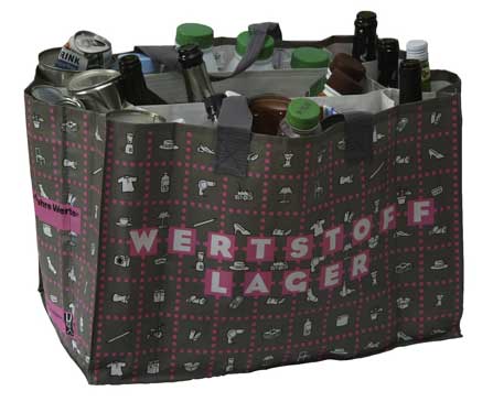 In den neun Innenfächern des 55 Liter fassenden «Wertstofflagers» lassen sich Glas, Alu, PET-Flaschen, Weissblech-Dosen oder Kleinmetalle leicht verstauen. Nach dem Gang zur Entsorgungsstelle kann die Tasche zusammengefaltet und lässig unter den Arm geklemmt oder zur Einkaufstüte umfunktioniert werden.