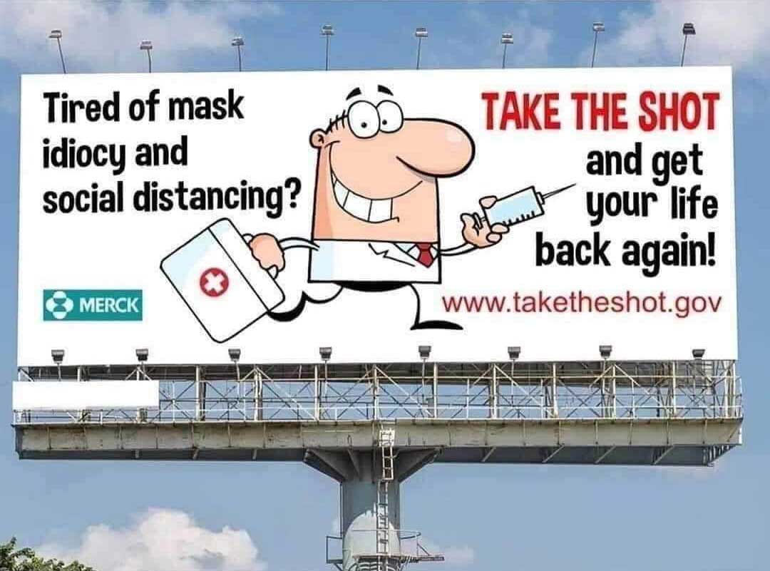 Einen vielsagenden Hinweise liefert ein Plakat des Pharmariesen Merck. Um der «Maskenidiotie» zu entkommen, soll man sich impfen lassen.
