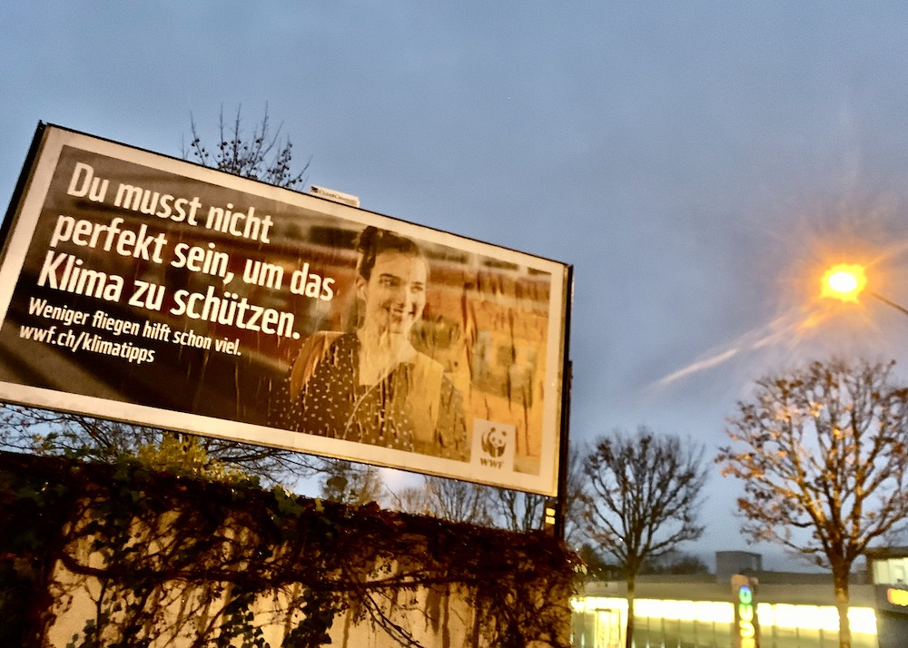 Ein Plakat am Strassenrand weckt einmal mehr meine Aufmerksamkeit. Es ist Teil einer Kampagne, doch die Botschaft ist immer die gleiche. Auf dem Plakat ist eine lächelnde junge Frau abgebildet, und daneben heisst es in grosser Schrift: «Du musst nicht perfekt sein, um das Klima zu schützen» – und, etwas kleiner: «Weniger fliegen hilft schon viel.»