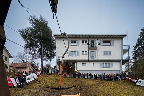 Seit drei Wochen ist das kleinste, steilste und laut Initiantin «geilste» Skigebiet in Betrieb. Dass mangels Schnee das Skifahren nicht möglich ist, macht überhaupt nichts, denn «Grauer Himmel» ist ein Kunstprojekt. Fünf Bügel drehen auf dem Skilift ihre 20-Meter-Runden. Aber hinaufziehen tut er niemanden, das darf er auch nicht, denn die Kontrollbehörde hat keine Genehmigung erteilt.
