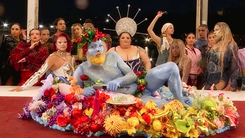 Die gesamte Eröffnungsfeier wurde bei strömendem Regen in Paris gefilmt – einschließlich eines blasphemischen Letzten Abendmahls, dem Bild von Leonardo da Vinci nachempfunden – allerdings mit voller LGBTQ+-Charakteren, mit einer fetten, großbrüstigen Transfrau in der Mitte, anstelle von Jesus. Ebenfalls zu sehen ist ein blauer Gnom, der mit einem steifen Penis tanzt.
