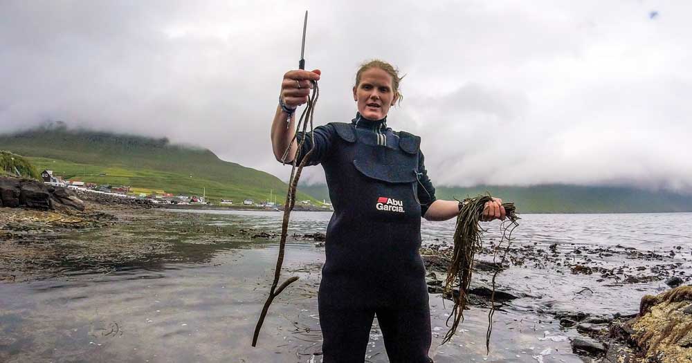 Mortensens Zeitfenster für die Ernte der Algenspaghetti beträgt eine gute Stunde. Nur solange zieht sich das Wasser in der Bucht von Tjørnuvík zurück und gibt die glitschigen Felsen frei. Mit ihrem Messer, Marke Kartoffelschälmesser, trennt sie die Algen so ab, dass sie die Wurzel nicht beschädigt. Drei Wochen, und sie werden wieder nachgewachsen sein. Dabei ist sie bemüht, festen Halt auf den Felsen zu finden. Dutzende Male ist ihr das schon misslungen, ist sie mit einem Platsch im Atlantik gelandet.