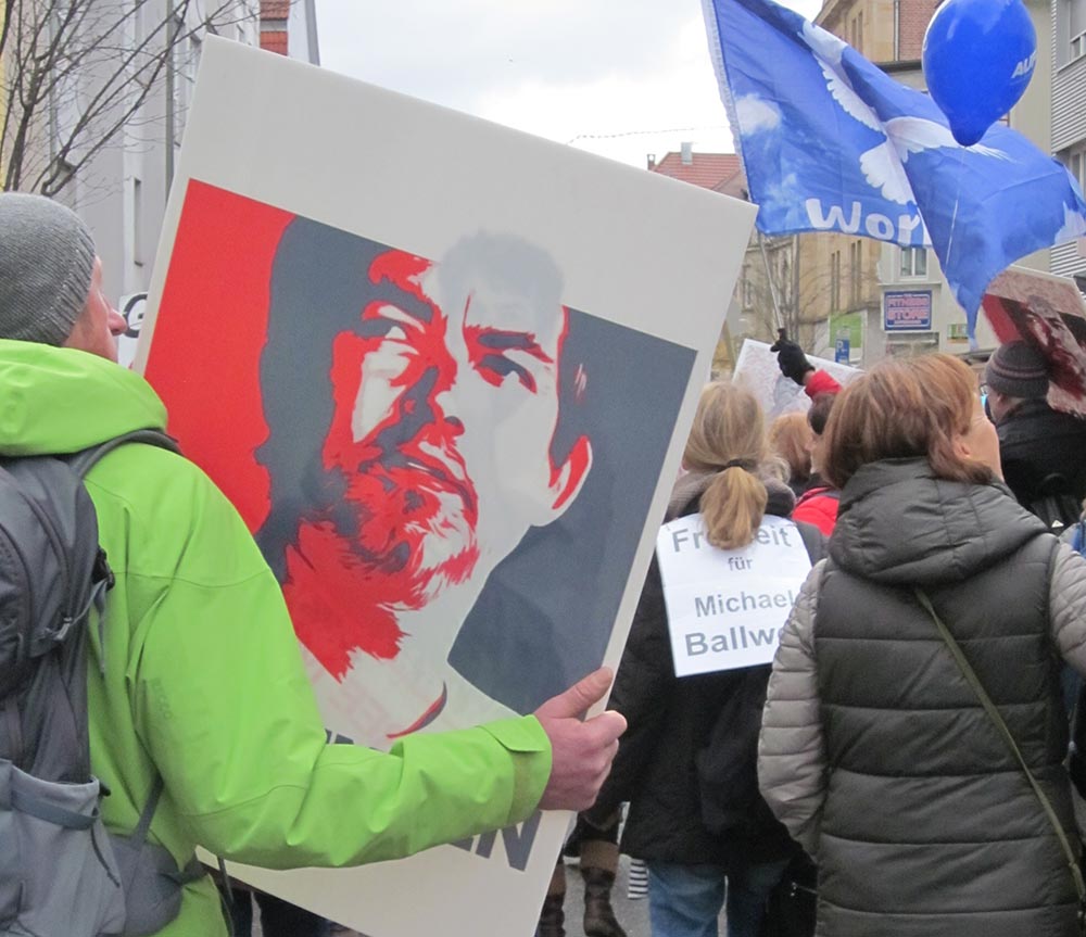 Vom Marktplatz Zuffenhausen, einem Vorort in Stuttgart, gingen die Demonstranten bis zur Justizvollzugsanstalt in Stammheim. Trommler und Schweizer Trychler - mit den großen Kuhglocken – sowie Teilnehmer mit allerlei Percussion-Instrumenten und Friedensfahnen machten die Bewohner der Vororte auf den Demonstrationszug aufmerksam und sorgten unter den Demonstranten für Gemeinschaft und Zusammenhalt. Die Polizei weiss, dass diese Demonstrationen absolut friedlich verlaufen und begleitete zurückhaltend.
