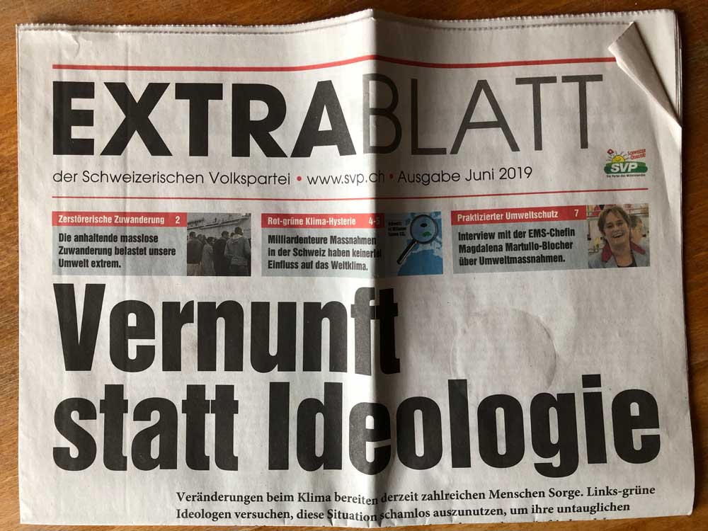 Wenn aber Roger Köppel meint, es gäbe «keinen wissenschaftlichen Beweis», dass «der Mensch einen maßgeblichen Einfluss aufs Klima» habe, und dass hauptsächlich die Zuwanderung die Umwelt belaste, aber unseren Verbrauch an Wohnbedarf, die Swimmingpools, die im Ausland mit Billiglöhnen produzierten Produkte mit Schweizer Label und das zunehmende Geschäft mit der Fliegerei nirgends erwähnt, degradiert er dieses «Extrablatt» als oberflächliches Werbemittel, das eigentlich nicht in den Briefkästen landen durfte auf denen ein Reklameverbot klebt.