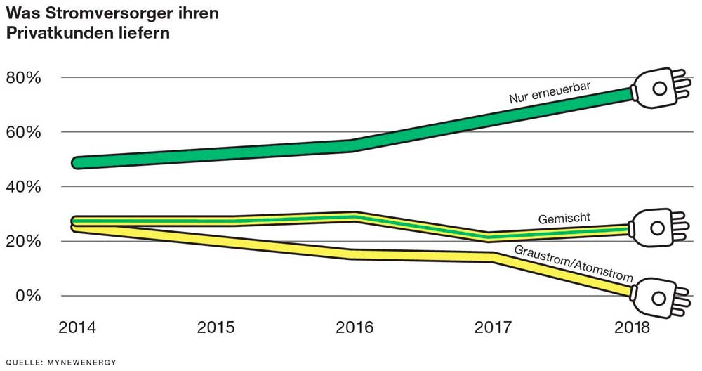 In den letzten Jahren hat sich die Zusammensetzung des Stroms stark verbessert. Bis auf wenige Ausnahmen haben die Anbieter fast vollständig erneuerbare Standardprodukte eingeführt. Die Entwicklung wurde durch die 2016 eingeführte Deklarationspflicht getrieben, wodurch plötzlich sichtbar wurde, dass die Versorger den sauberen Wasserstrom ins Ausland verkaufen und daheim fossilen Strom liefern.