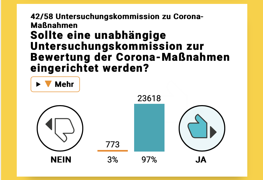 Schon 28.000 Menschen sollen ihren Willen hier eingegeben haben. Ziel ist es, einige 100.000 zum Mitmachen zu bewegen - nach Ansicht des Initiators Markus Bönig sollte das eine unmittelbare Grundlage für das nächste Regierungsprogramm sein. Markus Bönig hat schon bei den Rundfunkgebühren (Rundfunkalarm und Beitragsstopper ) und bei den Corona-Massnahmen (Test-Express, Liberations-Express und auch Maskenfrei.Express) Demokratie-Tools angeboten. Ihm geht es «nicht darum, bloss eine Partei zu wählen, sondern darum, unseren Willen transparent und unübersehbar zu machen.»