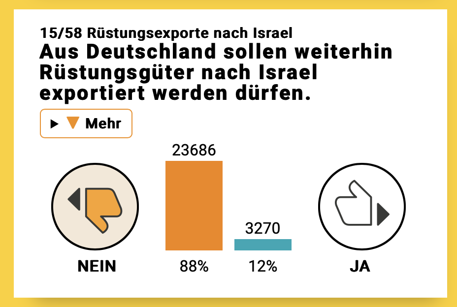 Die Demokratie-App bietet ein Umfragetool zu aktuellen Themen an: Anders als im Wahl-o-Mat, den Kritiker wegen seiner Frageauswahl als manipulativ erachten, wird hier nicht die Nähe zu einer wählbaren Partei ergründet, sondern unser politischer Wille in sehr vielen Parteifragen.