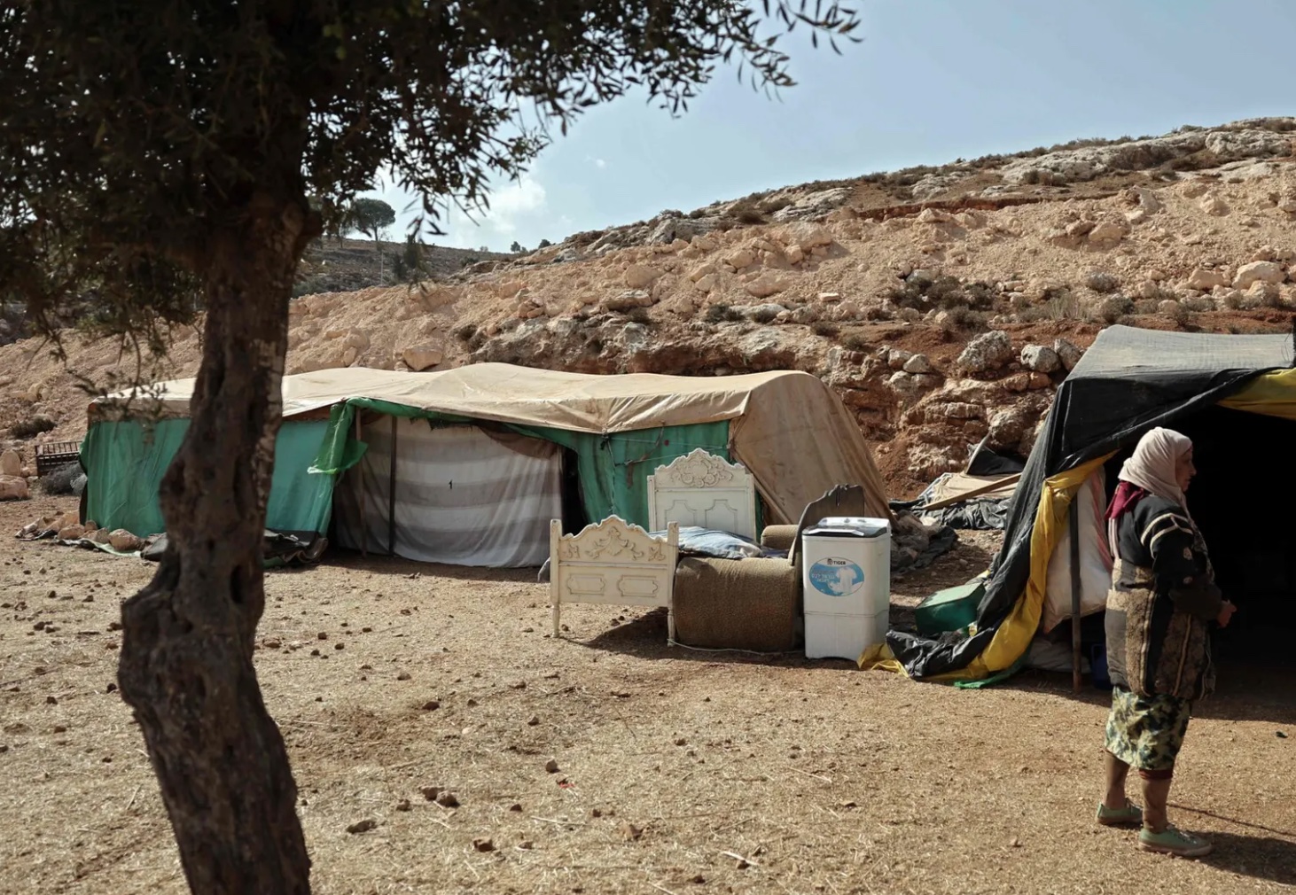 Die Grossfamilie von Abu Nayef, die aus 6 Erwachsenen, 3 Jugendlichen und 8 Kindern besteht, hat mehrere Kilometer von Wadi al-Seeq entfernt eine provisorische Bleibe gefunden. Die Vertriebenen wohnen in Zelten, das Wasser holen sie aus einem rostigen Tank, den Strom zum Kochen liefert ihnen das einzige mitgebrachte Solarpanel. Ihre Herde, zwei Dutzend Schafe und zwei Esel, suchen auf einer nahen Weide nach Gras.