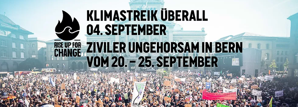 In der letzten Woche der Herbstsession – vom 20. bis zum 25. September – kündigen die AktivistenInnen mit der Aktion «Rise Up for Change» in der Bundeshauptstadt zivilen Ungehorsam an. Es soll gezeigt werden, wie ein klimagerechtes Zusammenleben in Zukunft aussehen kann, mit Workshops, Diskussionen und verschiedenen Aktionen auf der Schützenmatte in Bern.