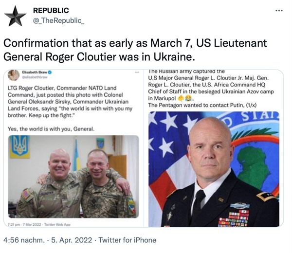 Dass sich unter den Eingeschlossenen auch NATO-Offiziere befinden, ist möglich, wenn nicht sogar plausibel. Cloutier war nachweislich in der Ukraine, wie dieser Twitter-Post zeigt: