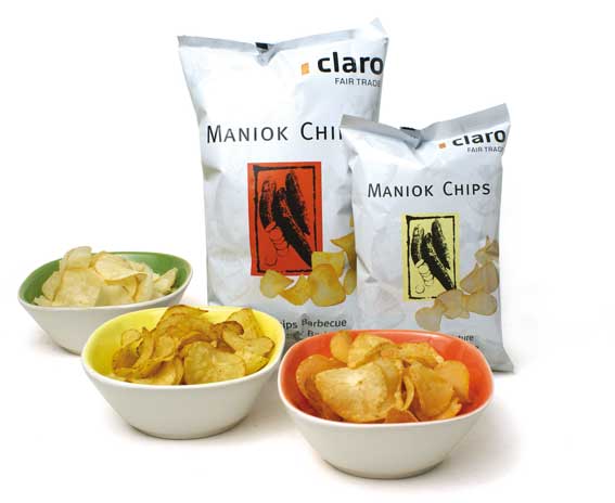 Maniok zählt weltweit zu den sechs wichtigsten Grundnahrungsmitteln — und ist in der Schweiz nun auch als Chips erhältlich. Die Chips von claro sind aus Maniokwurzeln, die von genossenschaftlichen Kleinbauern in Indonesien angebaut werden. Die Verarbeitung der Knollen findet in der Region Sukabumi, in der Nähe der Hauptstadt Jakarta, statt.