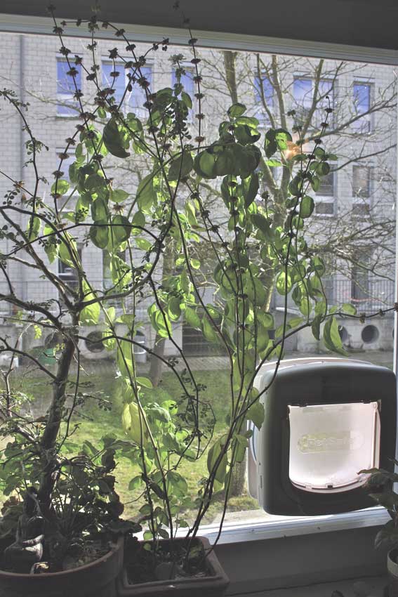 «Wenn du es schaffst, werde ich niemals nur ein Blättchen von dir verspeisen, versprochen!» beschwor ich ihn. Er sagte nichts – natürlich. Währenddessen bekam er den schönsten Platz am Küchenfenster, täglich aufmunternde Worte und tropfenweise abgekochtes Wasser. Vorerst liess er alles fallen und hängen, fast hätte ich ihn aufgegeben – doch dann begann er sich zart zu regen, winzige Blättchen sprossen hervor. Eifrig erklärte ich auch diesen, das Wort «Pesto» sei bei mir gestrichen und – grosses Basilikum-Ehrenwort – niemals würden sie in meinem Schlund verschwinden. Ein wenig reute es mich schon, denn die Blättchen dufteten bezaubernd. Der kleine Kerl entschloss sich also zu gedeihen, kletterte im Licht der erstarkenden Sonne die warme Fensterfront empor, schmückte sich mit weissen Blütchen und bewucherte grossblättrig die anderen Topfpflanzen. Wenn ich in der Küche hantiere, badet er mich in seinem Duft, leistet mir stille grüngewandete Gesellschaft.