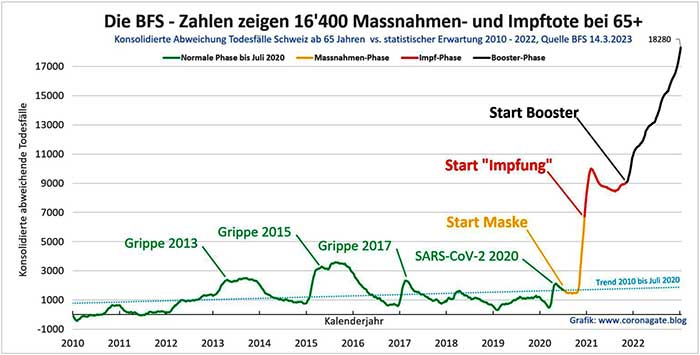 Beat Süess, Mitarbeiter der alternativen Ärzte- und Wissenschaftlervereinigung Aletheia hat auf seinem Blog Coronagate die Statistik der Übersterblichkeit mit den einzelnen Massnahmen kombiniert. Sofort wird ersichtlich, woran die Menschen starben: an den Massnahmen, insbesondere der Impfung.