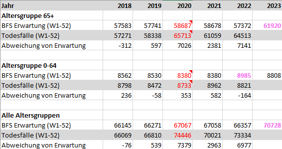 Inzwischen wird in den Mainstream-Medien spekuliert, vor allem über die markante Übersterblichkeit 2022, die ja mit der Impfung gar nicht hätte vorkommen dürfen. SRF News zitiert Fachleute mit Erklärungen von der Überbelegung der Spitäler, über Spätfolgen von Covid-19 oder hohen Infektionsraten bis zum heissen Sommer – alles Spekulationen ohne Datengrundlage.
