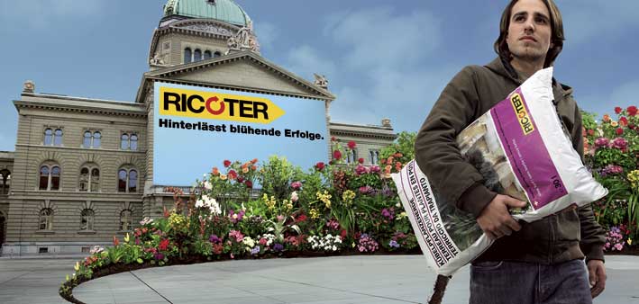 Dass Ricoter ein Schweizer Unternehmen ist, lässt sich unschwer an der neuen Kampagne erkennen: Beim ersten Sujet steht der Bundesplatz in Bern im Zentrum, weitere landesweit bekannte Orte werden folgen. Als Identifikationsfigur der neuen Lifestyle-Kampagne steht ein Guerilla-Gärtner nach New Yorker Vorbild. Die unerwartete Blütenpracht hinter ihm versinnbildlicht die Qualität der Erde.