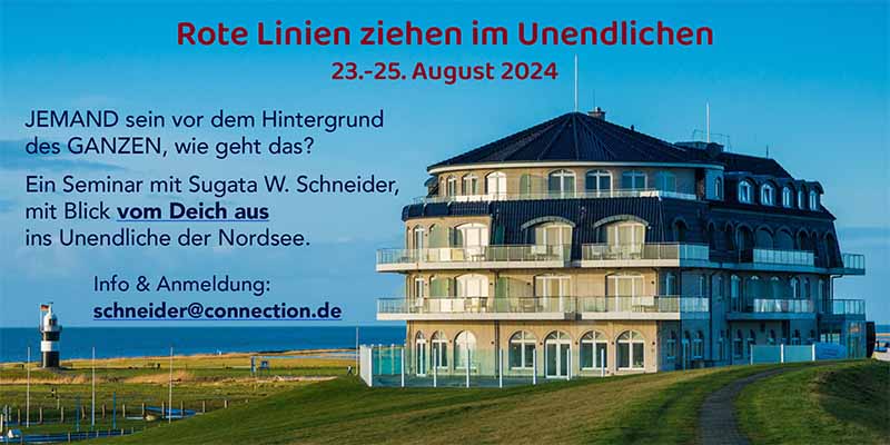 Vom 23.-25. August gibt Wolf/Sugata im Upleven an der Nordsee (www.upleven.de) ein Seminar, das rote Linien im Unendlichen zieht, private wie politische, und dabei Impulse gibt für eine Neuorientierung an Wendepunkten im Leben.