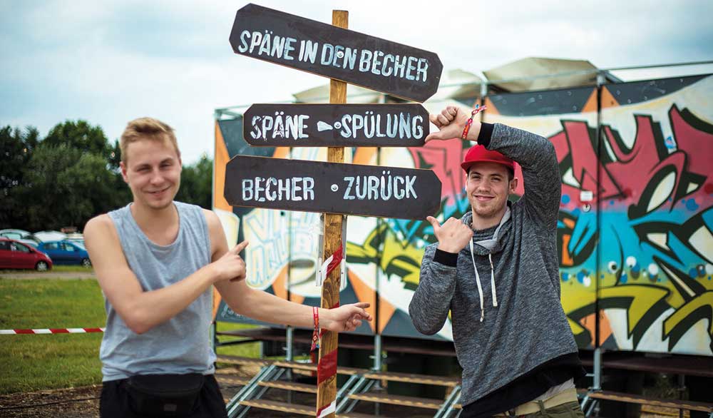 Seit fünf Jahren touren die Goldeimer-Jungs (und Mädels) mit bis zu 80 Toiletten durch die Festivalrepublik. Und seit fünf Jahren erzählen sie den Festivalbesuchern, dass ein Klo ohne Wasser das bessere Klo ist. Denn der menschliche Stoffwechsel-Output – gemischt mit Sägespänen – ist hervorragender Dünger. Und die Welt braucht inzwischen nicht nur Nährstoff, sondern auch das Phosphat, das wir ausscheiden.