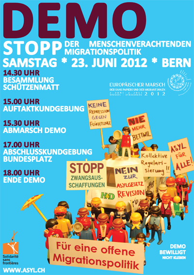 Angesichts dieser Tatsachen rufen «Solidarité sans frontières» am Samstag, 23. Juni 2012 zur gesamtschweizerischen Demonstration «STOPP der menschenverachtenden Migrationspolitik» in Bern auf. Sie sagen: