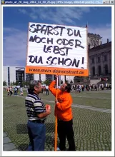 André Gäbler ist ein professioneller Demonstrant, der für seine Tätigkeit Geld nimmt. Oft trifft man ihn vor dem Berliner Reichstag. Mit einem Plakat, auf dem z.B. steht: «Sparst du schon oder lebst du noch?»