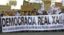 Seit drei Tagen finden in allen grösseren und vielen kleineren spanichen Städten Demonstrationen statt. Am Sonntag beteiligten sich weit über 100 000 Menschen in 60 Städten an den Protesten. Die Manifestationen finden völlig unabhängig von bestehenden politischen Strukturen statt und werden, wie im arabischen Raum, über soziale Netzwerke wie Facebook, twitter, etc. organisiert.