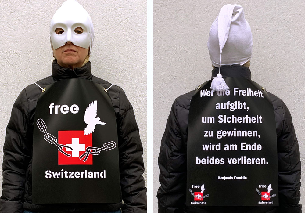 Die Verkleidung: schwarze Kleidung, Waggis-Zipfelkappe, weisses Halblärvli, vorne ein A3-Plakat mit dem «free Switzerland»-Logo. Hinten ein A3-Plakat mit dem Spruch von Benjamin Franklin - oder auch einem anderen Spruch.