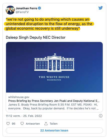 An einem Pressebriefing im Weissen Haus vom 24. Februar bestätigte der stellvertretende nationale Sicherheitsberater für internationale Wirtschaft der US-Regierung, Daleep Singh, die Abhängigkeit von russischem Erdöl und sagte einen Atemzug später: «Wir werden nichts tun, was zu einer unbeabsichtigten Unterbrechung des Energieflusses führt, da der weltweite Wirtschaftsaufschwung noch im Gang ist.»