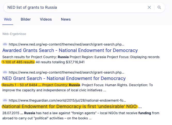 Die Suche nach «NED list of grants to Russia» ergibt mit der Suchmaschine «Startpage» eine vielversprechende Vorschau, die auf die Website des NED führen, aber wegen der dysfunktionalen Datenbank keinen zählbaren Ergebnisse liefern. Eine gute Übersicht liefert dagegen Swiss Policy Research. Es sind mindestens 73 prowestliche oder russlandfreindliche Organisationen in der Ukraine, die von den USA offiziell unterstützt werden.