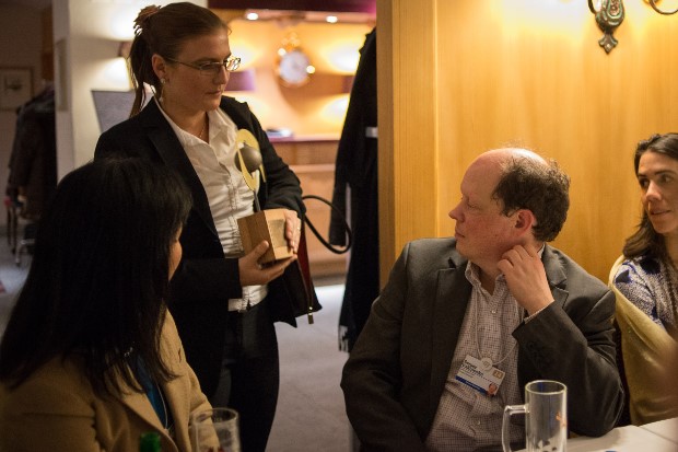 Mit grossem Vorsprung gewann Gazprom gestern den Public Eye Publikumspreis. Da an der vormittäglichen Zeremonie weit und breit kein Verteter des Unternehmens in Sicht war, wurde der Award spontan am späten Abend an Sergey Vakulenko in einem Davoser Lokal übergeben. Der Chef für Strategie und Planung bei Gazprom Neft war zufällig gesichtet worden, als er sich mit weiteren WEF-Teilnehmerinnen und Teilnehmern in einer Abendrunde befand.