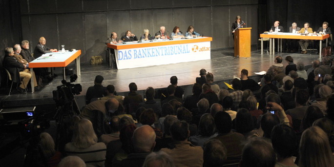 Obwohl das Bankentribunal nicht topaktuell ist (9.-11. April 2010), ist es noch heute hoch brisant – ein Stück Geschichtsschreibung, das wir uns vergegenwärtigen sollten, wollen wir uns nicht von der verfälschenden Berichterstattung der großen Medien einlullen lassen. Koryphäen der informierten Zivilgesellschaft wie Elmar Altvater, Harald Schumann, Sven Giegold, Ulrike Herrmann, Detlef Hensche und Christian Felber traten dort als Kläger, Zeugen und Richter auf.