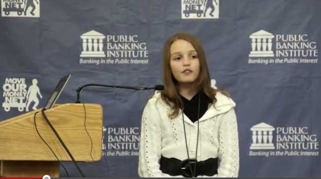 Wenn das kein Alarmzeichen für unser Geldsystem ist! Die mutige Rede des 12-jährigen kanadischen Mädchens Victoria Grant über die Funktionsweise unseres Geldsystems erobert seit April das Internet. Nach einer Rede vor 600 Rotary-Mitgliedern wurde sie am 27. April an die Konferenz «Public Banking in America» in Philadelphia eingeladen, wo sie das Publikum begeisterte. Ihr beeindruckendes Statement wurde auf youtube veröffentlicht und erreichte ein Millionenpublikum. Kernaussage: Das Bankensystem beraubt uns. Wie wahr!
