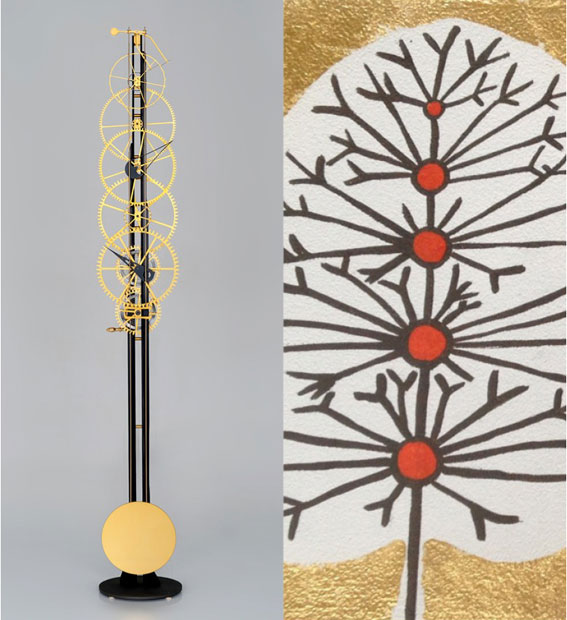 Die Baumsymbole von Silja Coutsicos setzen die Klänge in Farbe und Form zu Bildlandschaften zusammen. Ihre statischen, ikonenhaften Baumbilder korrespondieren geheimnisvoll mit den Zeitmaschinen und gemeinsam führen sie über die Zeit hinaus in andere ZeitRäume – ZeiTräume.
