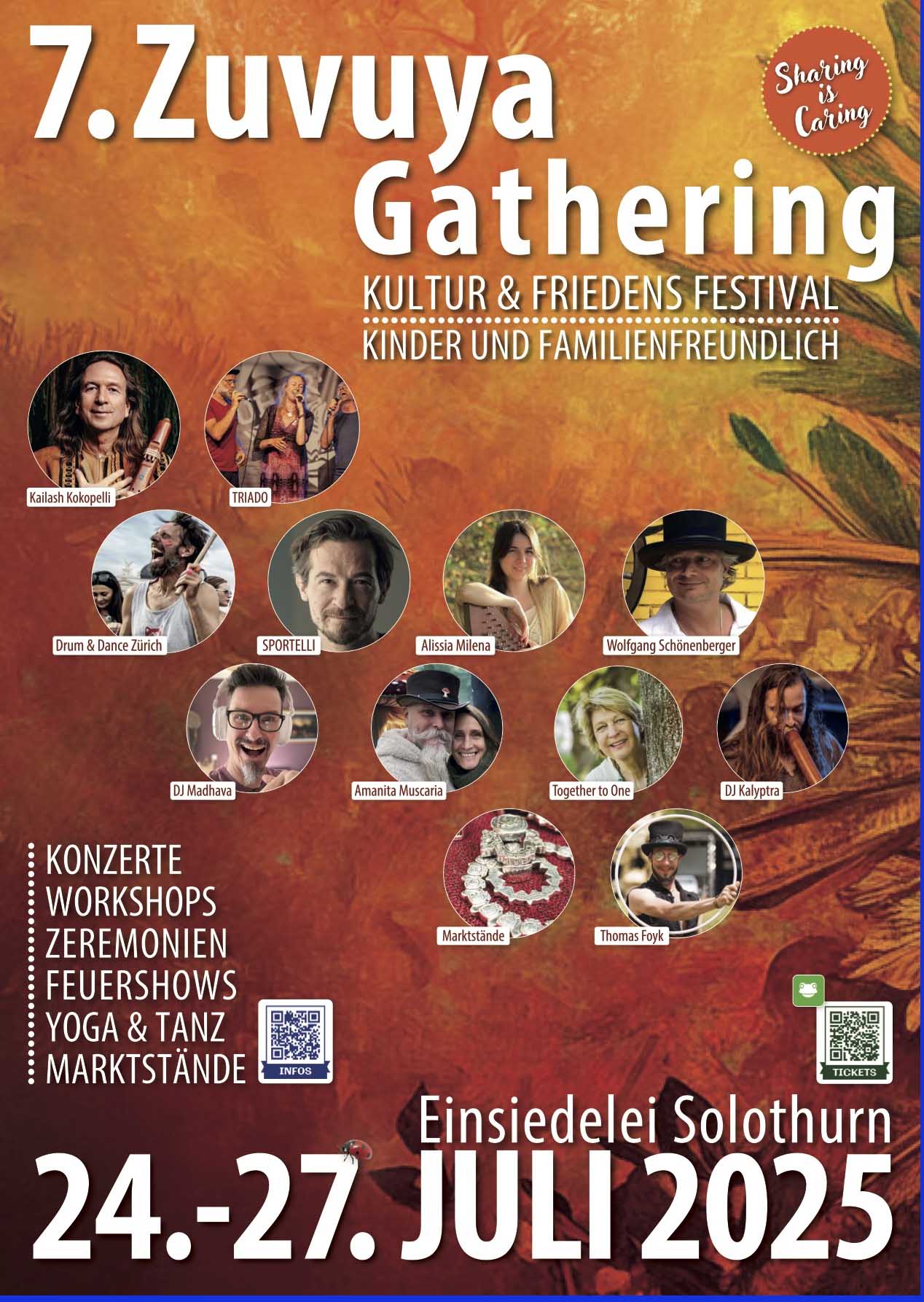 Zum Auftakt des neuen 13-Monde-Friedensjahres findet vom 24. bis 27. Juli 2025 das 7. Zuvuya Friedensgathering in der Einsiedelei Solothurn statt – umgeben von zwei Pfadiheimen und viel Platz für Referate und Workshops, Rituale und Cacao-Zeremonien, Musik, Tanzen, Feuer und vielem mehr. Das Gathering ist wie immer kinder- und familienfreundlich (d.h. alkoholfrei) und bietet auch den jüngeren Teilnehmer ein buntes Programm.