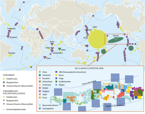 Tiefseebergbau und Explorationszonen plus Detailkarte der Clarion-Clipperton-Zone, inkl. der für einzelne Länder reservierten Bereiche. Quelle: Wikipedia und Meeresatlas - Daten und Fakten über unseren Umgang mit dem Ozean