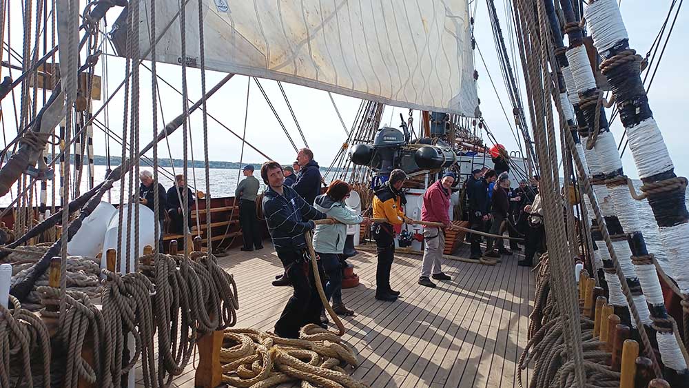 Am Ende, als wir beim feierlichen «All Hands» unsere Zeugnisse mit den geleisteten Seemeilen (es waren 316) und den gelernten Knoten erhalten und wieder den festen Boden des Rostocker Fischereihafens unter die Füsse nehmen, erfahren wir noch das Mantra der Roald:
