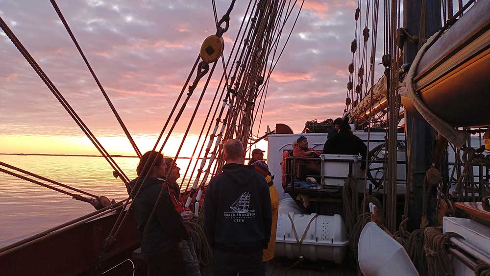 Die Roald Amundsen – benannt nach dem einstigen norwegischen Polarreisenden, dessen Hunde den konkurrierenden Motorschlitten gnadenlos überlegen waren – wurde vor über dreissig Jahren im Rahmen einer Arbeitsbeschaffungsmassnahme aus einem alten Stahlschiff der Nationalen DDR-Volksmarine in Wolgast nach dem Vorbild eines der letzten traditionellen Kap-Horn-Umsegler umgebaut. Seit damals segelt sie um die Welt – mit Schülergruppen, Segelfreudigen und erfahrenen Steuerleuten und Kapitänen.